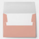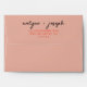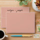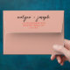 A retro modern hand written bright colourful wedding envelope. Which features calligraphy hand lettered bride and groom's names inblack colour. And personalised orange return address . On simple peach peachy trendy vintage colour background. Which suits the whole wedding suite.