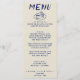 A colourful retro funky modern Periwinkle wedding dinner menu. Which features chic template design of boho vintage beige background and navy pen blue typography and hand written menu in blue with hand drawn piece of cake . Perfect and matching with the whole suite.