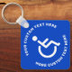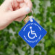 Square handicapped keychain with white disabled symbol on a blue background and white, circular text.
