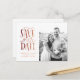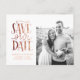 This modern save the date postcard features a single photo and handlettering in faux rose gold as well as customisable text for your names, wedding date, and wedding location. The back of the postcard can be customised to include a personal message or more wedding details.