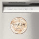 Personalize these unique wedding Save the Date circle magnets. It features a printed wood grain cut disc, perfect for your rustic wedding. Handlettering, modern script for the words "save the date". Customize the names, date, and location.