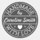 Handmade sticker featuring the text "Handmade" and "with love" designed as a white stamp over a dark grey background. Customisable name.