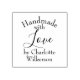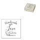 This custom rubber stamp features elegant and sophisticated writing so you can add a special and unique touch to your homemade or handmade items. The text is printed as "Handmade with Love by" followed by a sample signed name which you can personalise to include your own name or custom title. The word "Love" is printed in an enlarged script or handwritten style font across the centre.