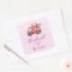 Handmade with love personalised stickers with a cute red watercolor truck. Carrying hearts and flowers in the back. I love u, written on the side. Whimsical and adorable. Light pink patterned background.