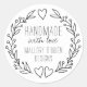 Handmade with Love stickers, personalised with your name or business name. Cute botanical design with doodle wreath of hearts and foliage. Lettered in skinny font typography and casual script hand lettering. Perfect for artisans of homemade gifts as well as small business and etsy sellers of handcrafted creations, country crafts, beauty products and more.