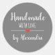 Modern "handmade with love" sticker with a white font on a grey background embellished by a cute red heart. Customise text.