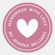 Round stickers with a white heart surrounded by the text "handmade with love" and your name or other custom text on a rose mauve background. Use as stickers for gifts and favours, product packaging etc.