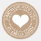 Stickers with a white (or custom colour) heart and text "Handmade with love" and custom name on a printed Kraft paper look background. Use as envelope seals, stickers for gifts and favours, product packaging etc
