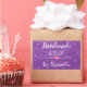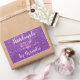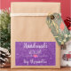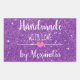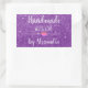Modern "handmade with love" rectangular sticker with a white font on a purple glitter background embellished by a cute heart. Customise text.