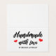 Folded business card for handmade goods. Handmade with love is written in a gorgeous black font, cornered by red hearts, on the cover. Add your name or name of business! Inside, you can write your contact information as well as care instructions - or ingredients list - of the handmade item.