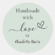 A sage green background, black text. Personalise and add your name. With the text: Handmade with love, by + a small heart.