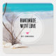 Handmade with love stickers with a gorgeous photograph. Tropical blue water and foamy surf in the background. A collection of seashells and stems set on a white sandy beach.