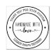 Custom rubber stamp for handmade crafts and products. The wording in the centre reads "handmade with love" in elegant calligraphy with love hearts. The template is set up for you to personalise the typewriter text around the edge, which currently reads "thank you for your custom [your name / business]". Please browse our store for coordinating stickers, labels and tags.