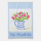 Hand painted Watercolor Tulips in a Blue Stripe Cornish Style Pitcher, printed on a kitchen towel.