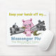 White mousepad with Messenger Plus! logo and a pink cartoon character.
