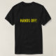 Hit the streets with this "HANDS OFF!" protest black tee (bright yellow text) attention getter. Ready to personalise & customise if preferred. Available in other colours and styles.
