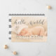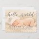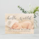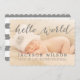 Handwritten Modern Baby Birth Photo Announcement Card | Silver Grey Glitter Script. Elke Clarke Designs ©. More styles available in our shop. Glitter (printed photo effect) typography overlay with the words "hello world" in a handwriting script font. Elegant and versatile design you can customise for both a baby girl and a baby boy new baby announcement. Silver glitter and white stripes or lines pattern on the back.