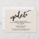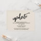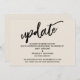This suite's distinction is due to the modern, handwritten script font used for accent phrases. In the event that you need to let your guests know that your wedding has been cancelled, this card provides a bold, eye-catching option. In this piece, the hand-lettered script font was used to create a graphic that reads "update". Use the template fields to add your personal details and make this unique, modern design your own. The background can be changed to any colour you prefer. Please reach out with any special requests or for customising assistance. // 100 //