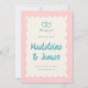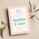 Retro inspired wedding save the date invitation in a bold retro colour palette of pink and turquoise, a wavy frame, with handwriting style fonts, a cute hearts illustration and "we say yes!" This is a fully customisable save the date template, all colours can be changed in the design tool if you like.