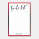 This simple design features a white background surrounded by a bright cherry red border that can be changed to any colour you like. This background has been overlaid with a black gradient image that creates an ombre effect. I've used a casual handwritten font to create a graphic that reads "to do list", and angled it quite large at the top. Your name appears at the bottom in an all caps, serif font that can be changed if you wish.
