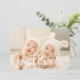 White Handwritten Modern Baby Birth Photo Announcement Card with White Script. Sparkle & Glitter ©. More styles available in our shop. Typography overlay with the word "welcome" in a handwriting script font. Elegant and versatile design you can customise for twins, new baby announcement. Gold, pink, and blue polka dots pattern on the back.