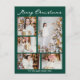 Elegant emerald green holiday postcard with chic handwritten scrawl MERRY CHRISTMAS above your family photo collage of your 5 favourite 2025 pictures. Modern Christmas postcards featuring one vertical photograph in the centre and 4 square pictures on the sides.