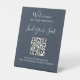 Elegant Handwritten script QR code wedding seating pedestal sign.