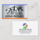 A faux silver cover features a creative rooftop building with grey shade pillars that incorporate handyman construction tools. The silver layer is encapsulated by blue and brown layers at the top and bottom of the card. Each handyman tool represents some of the service that you might offer e.g. The hammer-measuring tape can represent remodeling works, the roller brush-ladder for painting, the water drop-wrench for plumbing works and the bulb for electrical service. Below all this is the business name "HOME REPAIRS" which you can change.