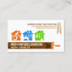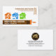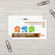 Cover features three homes that contain construction handyman tools. The tools can represent some of the work you might offer e.g. the first home with the hammer-sprocket can represent home repairs, remodeling, the blue home for plumbing and electrical works, the green home for gardening landscaping etc. The paint strip from the roller brush with an underlying wood panel can represent painting and carpentry. Here lies your prestigious name and job title. Over at the top, next to the ladder is the business name and contact details.
