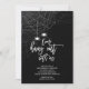 Modern "come hand out with us" halloween party invitation featuring 2 hanging spiders with their web set on a jet black background.