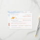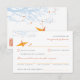 Origami orange paper crane hanging on sky blue branches with tangerine berries against a white background. The back is a matching design with a simple layout. A double sided wedding RSVP card.