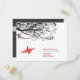 Origami red paper cranes hanging on branches against a white background. The back design is in matching reverse colours. A double sided wedding dinner reception and RSVP card.