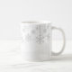 Beautiful ornate Christmas mug features snowflakes hanging at different heights from the top edge. Ornate large damask flourish against a white background.