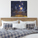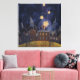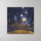 Decorate your home with a bit of whimsy with this original night scene canvas print painting of a girl standing on the roof of a brownstone in NYC with her dog hanging stars in a midnight blue sky. Anyone who loves fanciful art, city skylines, and New York City will enjoy this art on their wall.