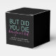 Funny "But Did You Die" Personalised Hangover Kit Square Favour Box in black, bright neon teal, and hot pink and personalised text with the celebration location and date, perfect for adding to DIY hangover relief kit favours for your bachelorette, girls trip, birthday, graduation party, or wedding bridal party gifts.