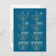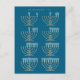 Colours: teal blue background, warm gold menorah outlines, white candles with glowing yellow halos, navy and gold text on white reverse side.