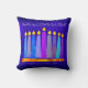 “Peace, love & light.” A playful, modern, artsy illustration of boho pattern candles in a menorah helps you usher in the holiday of Hanukkah. Assorted blue candles with colourful faux foil patterns overlay a rich, deep blue textured background. Faux hot pink purple pattern foil on a cornflower blue background for the reverse side. Feel the warmth and joy of the holiday season whenever you relax on this stunning, colourful Hanukkah throw pillow. Matching cards, envelopes, stickers, tote bags, wrapping paper, serving trays, home décor, and more are also available. Makes a great gift for someone special!
