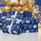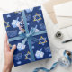 Beautiful Hanukkah wrapping paper in pretty blue with a cool pattern of Judaism star, dreidel for fun Chanukah games, and the Jewish menorah for the holiday.