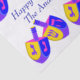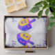 Choose this fun personalised Happy Hanukkah tissue paper covered in colourful Dreidels for kids... and adults too! Four sections of dark blue text can be personalised by adding your name to the HAPPY HANUKKAH message - two sections of light blue text proclaim "Oy! To The World". Either set of text templates can also be erased if you prefer. My super colourful Dreidels in purple, deep blue, yellow and saturated pink on a white background is a fun addition to your Festival Of Lights gift wrapping.
