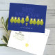 Celebrate the Festival of Lights with some fun! This festive greeting card showcases a group of happy olive characters who join forces (and flames!) to create a menorah — complete with the playful message “Happy Hanukkah from olive us.” It’s a cute way to send warm wishes from a family, circle of friends, organisation, or business. On the back hangs a decorative Star of David divider with text templates for your return address and name(s). A delightful blend of humour, tradition, and holiday cheer, this card is sure to light up the faces of everyone who receives it! Colours: Olive, yellow, and dark blue.