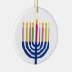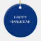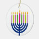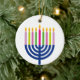 "Happy Hanukkah" ceramic round ornament featuring a colored Menorah.