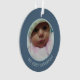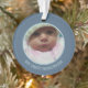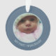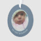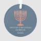 Personalise this double sided photo ornament in dark blue with a faux woodgrain menorah as a cute custom My First Hanukkah or Our First Hanukkah keepsake. Add your photo to the front where it will appear cropped into a round picture with a light blue frame on a background of dark blue. Personalise the arched text at the bottom if you like, then edit the back of the round Hanukkah ornament where there is a text template for your name and the year if you wish, all beneath the rustic faux wood menorah graphic. Create a unique Hanukkah keepsake with this double sided ornament design.