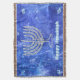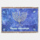 A glowing gold Hanukkah menorah and "Happy Hanukkah" in glowing blue and white text superimposed on a blue and white fractal image reminiscent of snowflakes in a storm. Chag Sameach!
