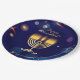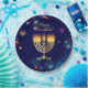 Happy Hanukkah Party Jewish Holiday decorative Menorah. Hanukkiah Symbol. Jewish Holiday Chanukahs Decoration with traditional Chanukah decorative symbols - Navy Blue color, colorful dreidels Chanukah wooden toys (spinning top), star of David and neon blue glowing lights illustration. Hanukkah Festival of lights Event Decoration. Jerusalem, Israel. Crafts & Party Supplies > Party Supplies > Tableware > Paper & Party Plates Judaica Modern Design. For a festive Hanukkah 2025 table setting.