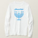 Hanukkiah Symbol. Happy Hanukkah Party Jewish Holiday Blue Menorah. Jewish Holiday Chanukkah Decoration with traditional Chanuka decorative symbol - Navy Blue colour hanukkiah menorah, candlestick with candles, star of David and neon blue glowing lights illustration. Hanukkah Festival of lights Event Decoration. Jerusalem, Israel. Clothing & Shoes > Women > Clothing > Tops & T-Shirts > Women's T-Shirts Modern Design with text template. Personalise them by adding name or wishes text. Two sides design.