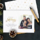 Minimalist family photo holiday card in a modern script typography design reading HAPPIEST HOLIDAYS with your custom message and your favourite photo framed with printed gold washi tape. Bring joy to your loved ones with this cute, simple, trendy, and understated stationery. The back features a printed golden dot and star pattern.