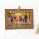 "Happiest Holidays" Christmas card features a horizontal format with landscape photo and modern real gold foil greeting text that frames and overlaps the picture. Personalise the simple script text with a family signature and the year, and choose to include an additional message on the back of the card. Two additional photo spaces are also included on the back. Includes a brass brown background colour.