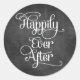 Happily ever after written in white scripty font on a chalkboard background. Perfect for wedding events.