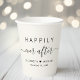 Chic light cream paper cups for your wedding reception, engagement parties, couples showers and other wedding celebrations that feature "Happily Ever After" in simple modern typography and a stylish script with swashes, your first names joined by a heart and your wedding date.