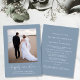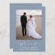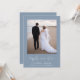 Elegant and chic dusty blue elopement or private wedding announcement and post-wedding reception invitation that features your photo, "happily ever after" in a stylish white script with swashes and your first names, wedding date and location. On the back, customise your wedding announcement and reception or party invitation and sign your married names in a signature-like white script.